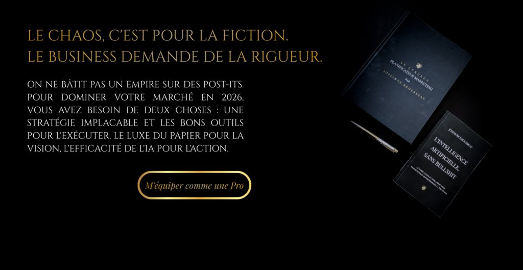 Depuis 2006, je suis la Partenaire stratégique de votre croissance numérique. J’apporte aux marques et dirigeants une structure marketing irréfutable, alignant contenu, branding et systèmes de croissance pour des résultats mesurables et une autorité de marché incontestée. Aujourd’hui je fais uniquement de la consultation et stratégie en étant à l’avant-garde avec des certifications reconues tel que Google Ai Essentials et en Neuro-Marketing avec l’université Johns Hopkins.
